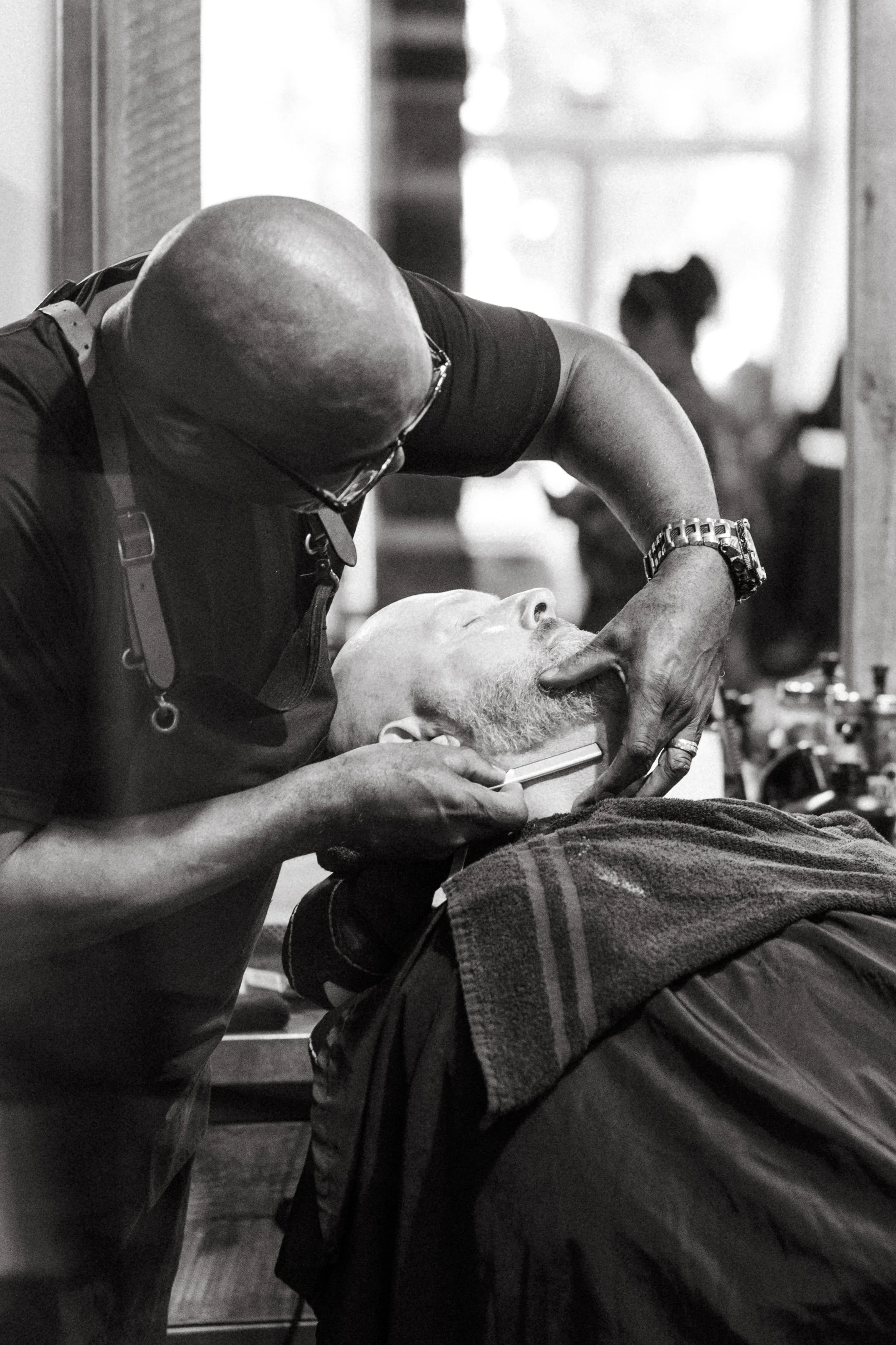 Our beard trim with shave pre-treatment, hot towel and sharp razor’s edge line-up.